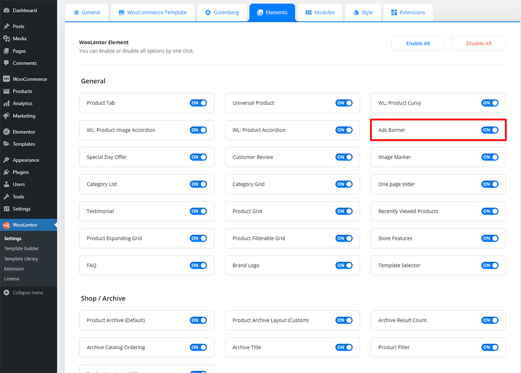 Go to WordPress Dashboard > WooLentor > Settings > Elements. From the list of Elements, turn ON the “Ads Banner” widget.