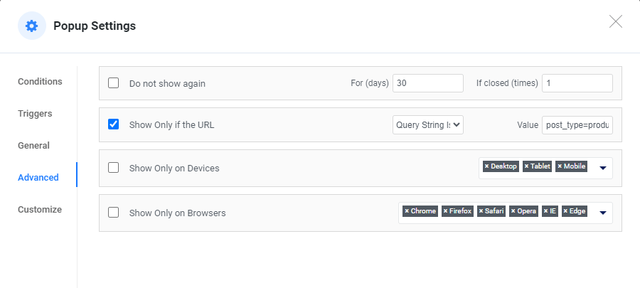 You have the ability to exert precise control over both the conditions and timing that dictate when and how your popup will be presented to your audience.