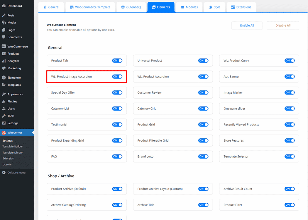 Go to WordPress Dashboard > WooLentor > Settings > Elements. From the list of Elements, turn ON the “WL: Product Image Accordion” widget.