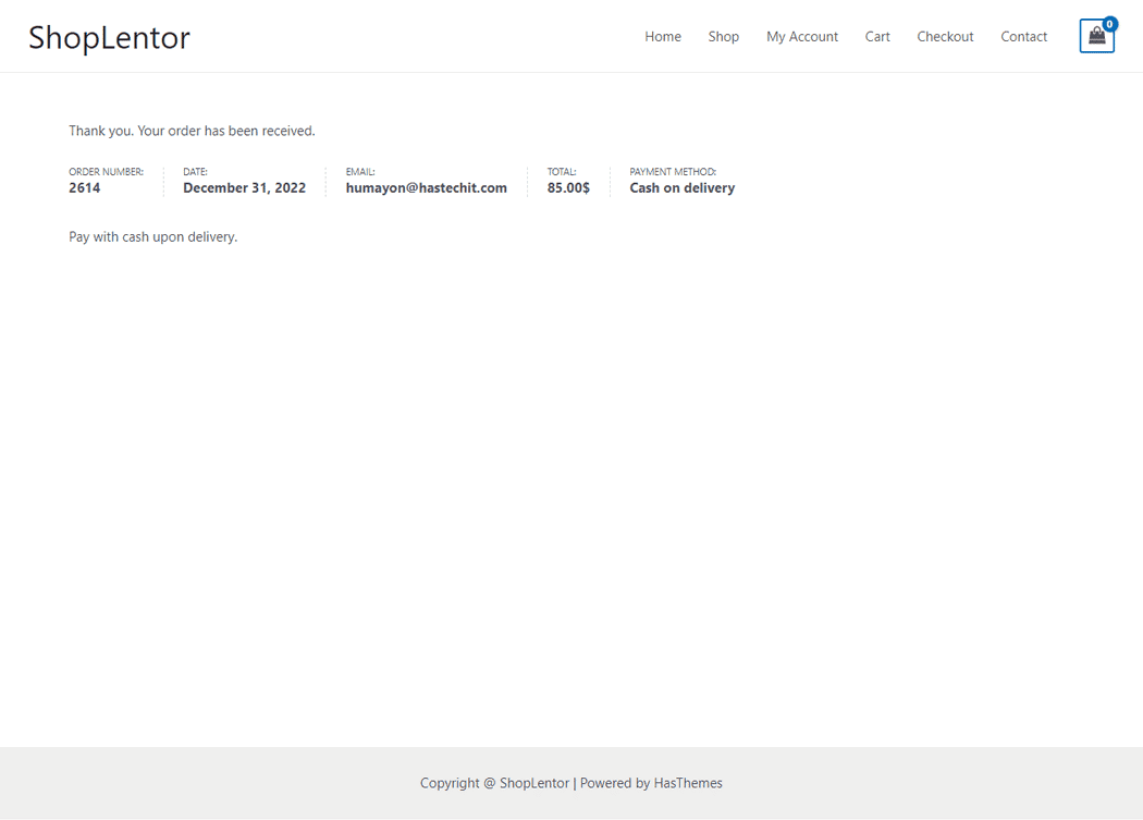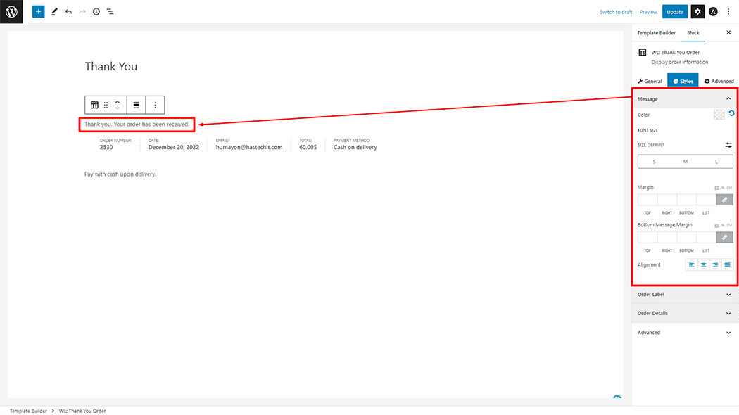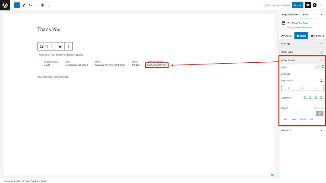 Order Details: You can change the Color, Font Size, Alignment, and Margin style Thank You Order as needed.