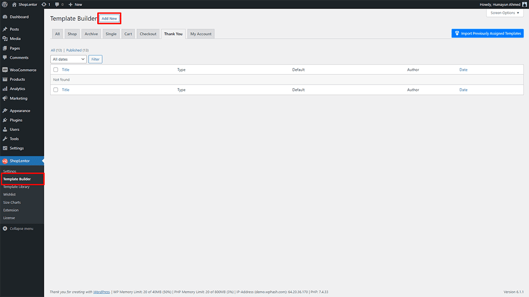 Go to Dashboard > WooLentor > Template Builder. Click the “Add New” button on the top right beside the text “Template Builder” to create a Thank You Order page Template