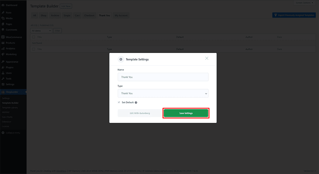 First, set the name of your Template and select it in the popup box for template settings. Select “Thank You” from the dropdown type list. check the Set Default and save the settings by clicking the Save Settings button.