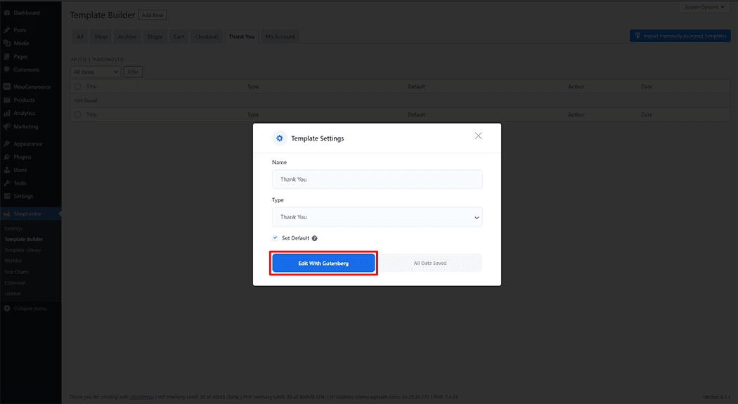 To add the Thank You Order Block, click the “Edit with Gutenberg“ button to edit the Thank You Template