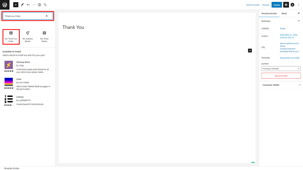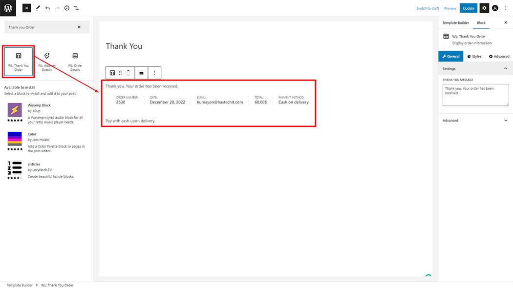 If you want to leverage the Thank You Order feature on your WooCommerce store, you will need to use a Block named “WL: Thank You Order“. To do so, simply search for the Block in the Gutenberg Block panel, and use it on the corresponding template that you have created for the Page.