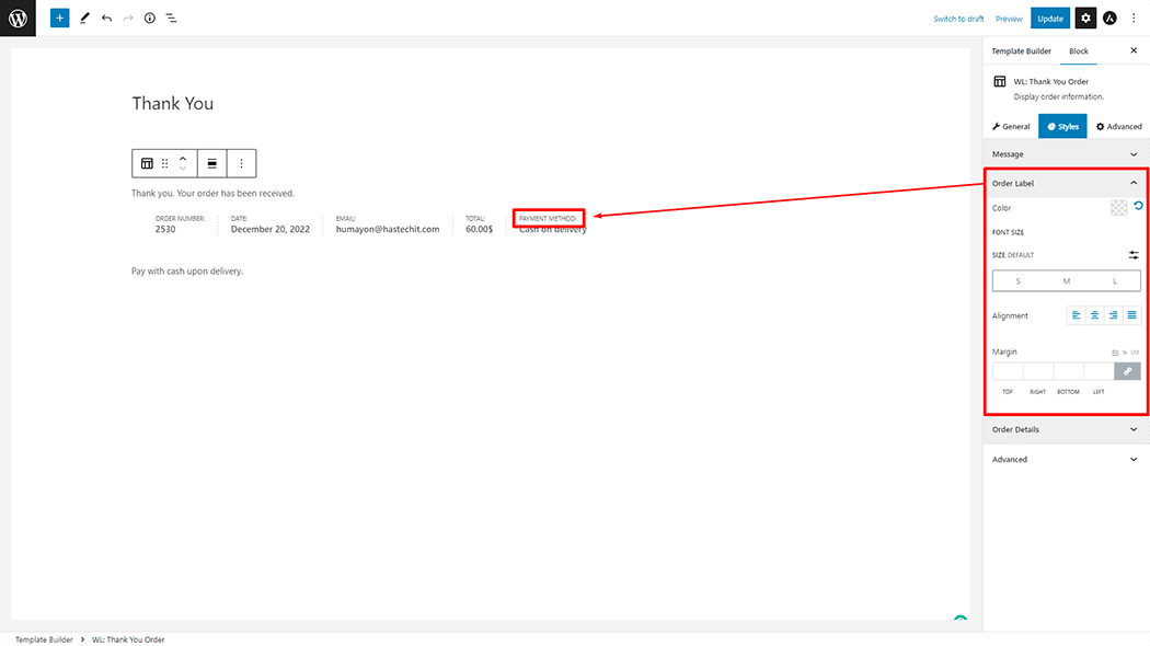 Order Label: You can change the Color, Font Size, Alignment, and Margin style Thank You Order as needed.